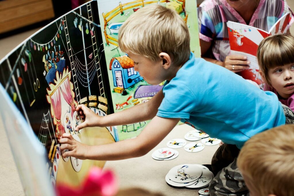De magnetiske figurer sættes på planchen, efterhånden som historien skrider frem, og børnene er aktivt med hele vejen.