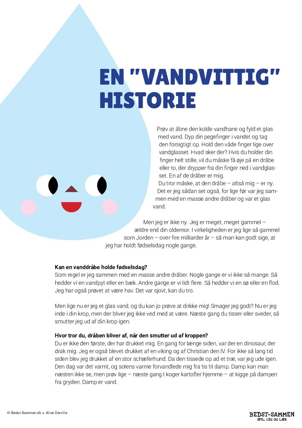 Historien fylder 2 A4 sider og kan bruges sammen med et projekt om vand og kredsløb – eller til hyggelig læsestund. Der er mulighed for smil, undren og viden.