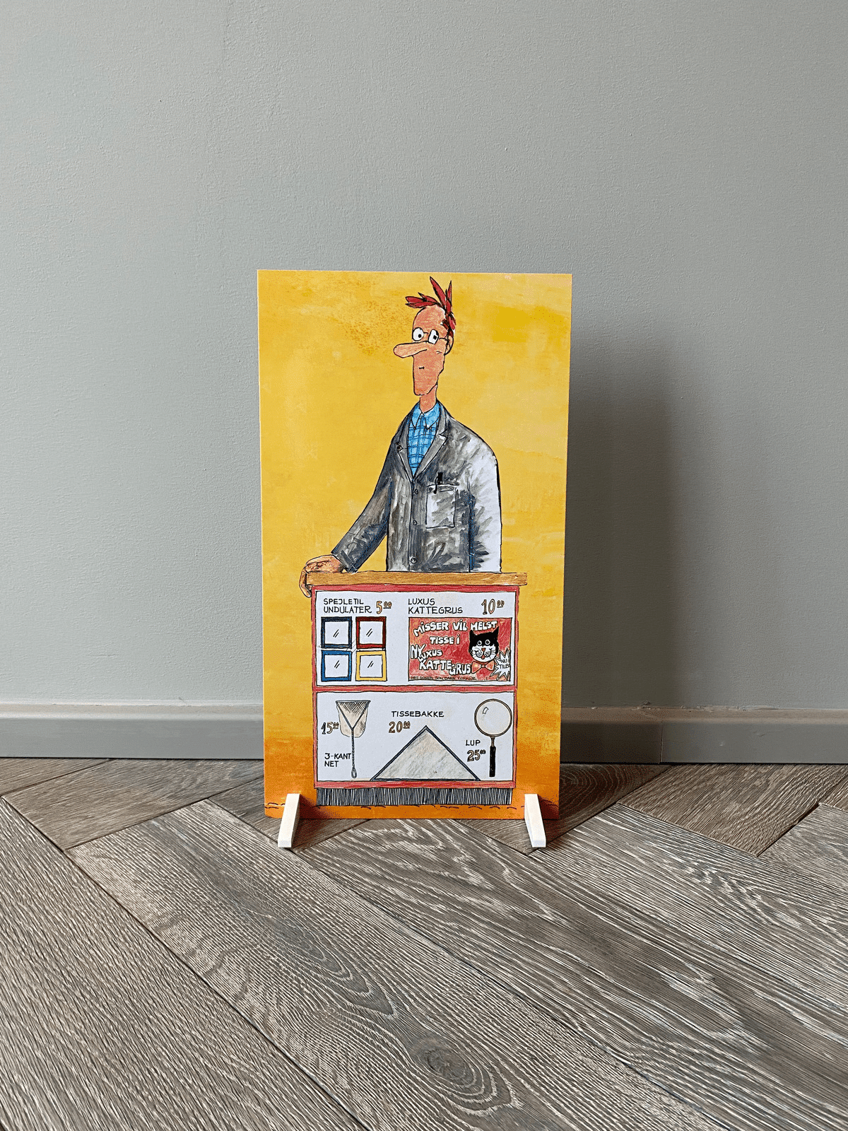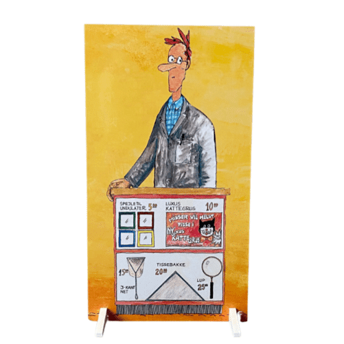 1 stk. planche i robust plastmateriale med tegning af Godtfred som står bag sin disk – Mål 23 x 42 cm. På planchen er der tegninger af forskellige ting, som kan købes i butikken. Genstandene er udformet i geometriske grundfigurer f.eks. kvadratiske spejle, cirkelformet lup etc.