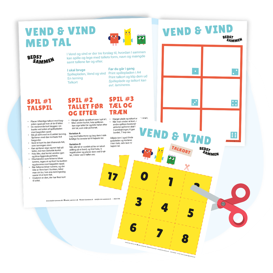 VEND & VIND med tal Indeholder en spilleplade, talbrikker med tallene fra 0 – 20 og tre sjove forslag til, hvordan I sammen kan spille og lege med tallenes form, navn og mængde, samt tallene som kommer før og efter hinanden.